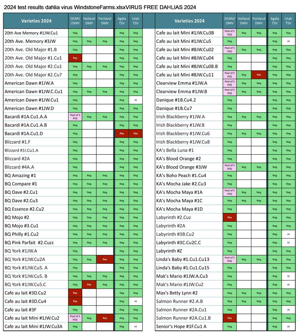 Samples were analyzed at AGDIA, Inc. (Elkhart, IN) and at UTAH State Diagnostic lab (Logan, UT). Positive pools of 5 plants (light pink) found by Agdia were tested by the individual plant at Utah State University. Utah tests for DMV Holland and Portland viruses separately, while Agdia reports them as a composite test for Dahlia common mosaic virus and dahlia mosaic virus. Note, when tabs give differing results, I use the positive result regardless of which lab reported the result. All plants tested for TSV by Utah, were also tested for TSWV and were negative.